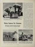Hailed as a step forward in the motion picture art, Circarama consists of a synchronized battery of Eastman 16mm model 25 sound projectors which simultaneously project color and sound movies on 11 individual screens arranged in a complete circle. It constitutes the first known application of color and sound pictures to the circular screen. (It had been accomplished with black-and-white and silent films about forty years ago for a world’s fair exhibit.) Spectators, standing in the middle of a specially-built theater, view the continuous action on an overhead screen eight feet high and 40 feet in diameter, which completely encircles the audience.