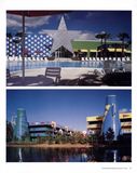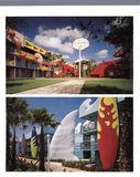 Resorts are a series of glorified motels dressed up in full pop-culture regalia. Eschewing subtlety and nuance for zip and pizzazz, the architects have created a live-in playground where exterior stairs pose as three-story megaphones and parapets dance like brightly colored waves. Like everything else in the Disney universe, the All-Star Resorts are aggressively themed: Phase I is sports, and Phase II will be music. Each phase includes five pairs of three-story residential buildings, a couple of themed swimming pools, and a one-story commercial building with registration lobby, stores, food court, and video arcade. With its relentless attack on the senses, this is an architecture of instant gratification.