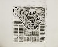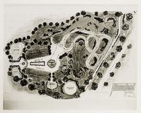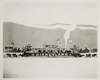 As you look at the schematic aerial view map, I would like to explain that DISNEYLAND takes up 160 acres of ground; 60 acres will be the Park itself, the rest of the acreage is for parking purposes. This area can accommodate ten thousand cars. There will be an 8 to 15 foot embankment around the 60 acres, and on top of this embankment will run a 5/8 scale steam locomotive, weighing 15 tons, pulling six coaches, carrying approximately 300 people. This locomotive will be the old-fashioned type as seen at the turn of the century. Also around the 60 acres will be a landscaped berm which will keep anyone from looking in or out of DISNEYLAND. The theme of DISNEYLAND is that when you park your car in the auto park you leave the present day behind, and when you enter DISNEYLAND you will find yourself in the land of yesterday tomorrow, and fantasy. Nothing of the present exists in DISNEYLAND.