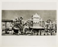As you come to the entrance you will notice the DISNEYLAND Railroad Station. This is the Marquee to DISNEYLAND. As you walk through a tunnel into DISNEYLAND you find yourself in a Civic Center or Town Square at the Turn of the Century, any time from 1890 to 1910. Here j^ou will see the Town Hall . . the Fire Engine House with the Old Fashioned Fire Engine . . the Bank . . the Post Office . . the Disneyland Emporium and the Old Opera House. At the Civic Center you can get a horsedrawn streetcar that will take you right up MAIN STREET.