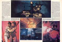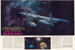 You might say that it was only a matter of time before Walt Disney Studios produced a multi-million dollar science fiction film, but The Black Hole is in many ways more than that. It represents a new attitude at the studio: to produce films for a more adult marketplace. And there is much about this film that is precedent-setting. Produced at a cost of $17 1/2 million, it is the studio's most costly production to date. It is their first film to be rated PG and it does not carry the Disney name above the title. All of this is evidence that Disney is willing to change with the times. As far as the plot goes, Disney is not talking, but they are quick to emphasize that The Black Hole will be loaded with eyepopping special effects which include miniatures, cel animation, travelling mattes, and over 150 matte paintings. In terms of creating state of the art technology, Disney technicians rarely take a back seat to anyone. For The Black Hole they created the ACES (Automated Camera Effects System) camera which is a computer operated, repeatable movie camera system for photographing the miniatures. It has a new lens and allows for greater depth of field. They have also developed the Matte Scan camera which allows for movement of the camera while photo graphing mattes.