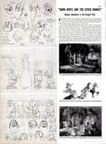 At the Mickey Mouse studio in Hollywood, Walt Disney and his prodigious crew of artists have just finished the first feature-length animated film ever made. It is the story of Snow White and the Seven Dwarfs, which millions of children have read in Grimm's Fairy Tales. Snow White cost $1,500,000 and took three years to make. Using human characters extensively for the first time, Disney began by making charts to show how each one should be drawn. The charts at left show (top) the seven dwarfs: (centre) their comparative heights: (bottom) specificatiors for Sleepy. Twenty-five artists painted the pastel backgrounds. Then 300 animators drew the characters in motion on sheets of celluloid. Two million "cels" were painted before 250,000 were finally chosen to be successively photographed against the backgrounds (see below). Snow White was aimed at the Christmas trade but was such a gigantic job that only Los Angeles will see it before mid-January. Meanwhile its advance publicity has reached such proportions that Mr. Disney may well worry lest his public expect too much.