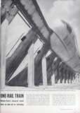 Last month a new monorail, built at a cost of $2.4 million, was demonstrated near Cologne, Germany. Called the "Alweg" after its backer, the Swedish multimillionaire Axel L. Wenner-Gren, it is a passenger-carrying scale model which rides on a single row of wheels. Extra wheels grip the sides of the rail and keep the car from falling off. Because the rail is sharply banked, the train can easily take turns at top speed. The Alweg's designers say full-sized monorails will travel at more than 200 mph.