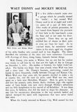 Walt Disney (his name is Walter, but no one but his mother everthinks to call him by it) first saw the light of day in Chicago onDecember 5, 1901. His mother is German, his father Irish-Canadian.The family was large; four sons already when Walt was born and asister later. Mr. Disney’s business, contracting, caused the family to move frequently, chiefly between Chicago and Kansas City. When Walt was four years old, his parents decided to make a try at country life, and the next six years, until Walt was ten, were spent on a farm in Marceline, Missouri. Here he grew to know and love the animals, cows, horses, ducks, chickens, pigs-the regular roster of farm beasts who now move through Mickey’s adventures and the Silly Symphonies to the marvel of all beholders. It was those five years, he believes, that did the most to shape his character. At any rate his unconscious absorption in the way animals looked and moved stamped his mind with impressions that have never failed him since.
