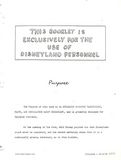 Prepared for Disneyland, Inc. by WED Enterprises. The Purpose of this book is to ESTABLISH approved, FACTS, AND INFORMATION ABOUT DISNEYLAND, and is primarily designed for TRAINING purposes.