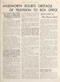 While RKO probably will substitute the Disney color cartoons for the Van Beuren "Rainbow Parade" series, other Van Beuren product most likely will be retained, M. H. Aylesworth, RKO board chairman, indicated this week. The three-year distribution contract signed with Walt Disney Productions in Hollywood last week calls for delivery of from 18 to 28 animated cartoons and one animated feature a year, Mr. Aylesworth said. As is customary with Disney, there will be no definite release schedule. Meanwhile, the Van Beuren product, including the 13 color cartoons and some 33 other short subjects, is being sold to exhibitors for 1936-37, Mr. Aylesworth said. Disney still has 15 cartoons to deliver to United Artists on its expiring contract, and it will be in January, 1937, before the "Mickey Mouse" and "Silly Symphony" series will be available to RKO accounts, he explained. While the distribution contract with Van Beuren Corporation expires in August, there have been no discussions as to the future, but RKO's 50 per cent interest in Van Beuren in no way would be affected, Mr. Aylesworth said. He expressed gratification over acquisition of the Disney product. "Snow White," the first feature-length cartoon from Disney, is just getting started after a year of preparation. A release date is unpredictable, he said. It will be "a sensation and revolutionary as an art form," he added. Mr. Aylesworth said that RKO had not approached Disney but that negotiations started a month ago when overtures were made by Roy O. Disney, general manager of the company. While "looking to the future," Walt Disney Productions made no arrangements on television in the RKO releasing contract, Roy Disney said in Hollywood. "We are interested only in having our product shown in theatres," he said. "Any plans for television must necessarily be in the future, and we will consider the matter when and if it arises. Dispute on that subject was one of the reasons that we broke with United Artists. Meanwhile we are concerned entirely with theatre exhibition."
