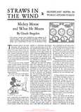 In 1920, when [Walt Disney] was employed in a commercial art studio in the Middle West, he used sometimes to work late at night. Toward midnight he often heard scratching against the metal wires of the waste-baskets which held the discarded lunch boxes of the staff. The mice were after their evening meal. From being merely interested Disney became fascinated with the litte creatures. He tamed a number of them and soon had them living together in a cage. One became so friendly that he allowed it on his desk while he worked. So though the actual idea of the Mickey Mouse saga came to him only afterward, while he was travelling on a train between New York and Hollywood, its germ had already been planted in his mind.