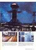 Facing this gigantic galactic curtain and mounted on the floor of the stage are shiny twin tubular steel tracks that extend 68 feet to the rear wall of the studio. There, in a glass-enclosed humidity-controlled environment, are the banks of the NOVA 3/12 computer system from Data General. Computer video terminals and display screens can be seen in abundance both within the glass cage and alongside the gleaming metal tracks where a complex series of servo motors and metal arms and platforms rest. A long crane arm extends from the center of the "car" that rides on the tracks. Cables, some two-and-a-half inches in diameter and containing up to 150 pairs of wires, form a long umbilical card back to the glass cage.