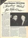 Dressed in jeans and a blue turtleneck sweater which almost matches his slightly down-slanted eyes, Jack Clayton is a gracious host. His Disney Studios office is not glamorous but simply furnished, decorated with an assortment of books, last year's Christmas cards, and a black-and-white watercolor by Something Wicked production designer Richard MacDonald. There is an electric kettle to provide Clayton with his ever-present cup of instant coffee, a substitute for the cigarettes that he gave up five years ago.