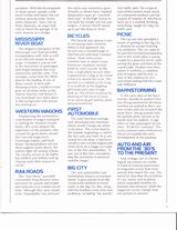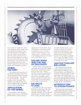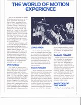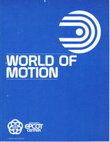 The facility housing the World of Motion attraction is one of the most impressive structures in Epcot Center. Standing 65 feet tall, its huge (320 feet diameter) cylindrical form is sheathed in gleaming stainless steel panels. Overall, its circular shape, suggestive of a wheel, is very appropriate for a building containing World of Motion. Passing through the blue tiled entrance area, we are inside. Use of stainless steel is continued here as an interior finish, along with walls carpeted in a rainbow array.